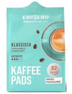Eine Packung Eduscho Kaffee Pads Klassisch enthält 32 Pads. Diese Menge ist ideal, um Ihren täglichen Kaffeebedarf zu decken und auch Gäste zu verwöhnen.