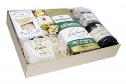 Das Präsent enthält eine sorgfältig zusammengestellte Auswahl an süßen und herzhaften Köstlichkeiten sowie edlen Getränken. Dazu gehören unter anderem feinste Pralinen, zarte Kekse, aromatischer Honig, fruchtige Konfitüre, ausgewählte Käsespezialitäten, feine Wurstwaren, knusprige Cracker, pikante Oliven, aromatischer Kaffee, feiner Tee, fruchtiger Saft und edler Wein. Die genaue Zusammensetzung kann saisonal variieren.