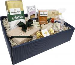Das Präsent enthält eine Auswahl an hochwertigen Teesorten (Echter Ostfriesentee, Friesenmischung, Grüntee), Kluntje (Kandiszucker), Kandis-Sticks, Gebäck und ostfriesische Spezialitäten.