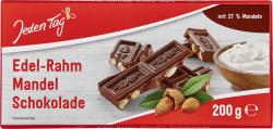 Jeden Tag Edel-Rahm Mandel Schokolade enthält Zucker, Kakaobutter, Kakaomasse, Vollmilchpulver, Mandeln (15%), Sahnepulver, Emulgator: Sojalecithin, natürliches Aroma. Kann Spuren von Haselnüssen und anderen Schalenfrüchten enthalten.