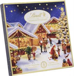 Der Lindt Weihnachtsmarkt Tisch-Adventskalender enthält eine vielfältige Auswahl an Lindt Schokoladenkreationen, darunter Mini Pralinés, Vollmilch-Schokolade, dunkle Schokolade, Nougat-Pralinen, Gianduja-Pralinen und weihnachtliche Schokoladenfiguren. Die genaue Zusammenstellung kann variieren, aber es ist für jeden Geschmack etwas dabei.