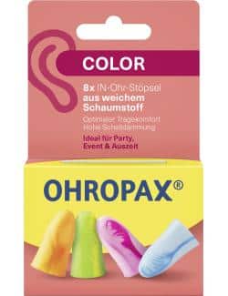 | Ohropax Color | Schaumstoff | 36 dB | Leuchtende Farben, angenehmer Tragekomfort | Schlaf, Arbeit, Reisen, Freizeit |